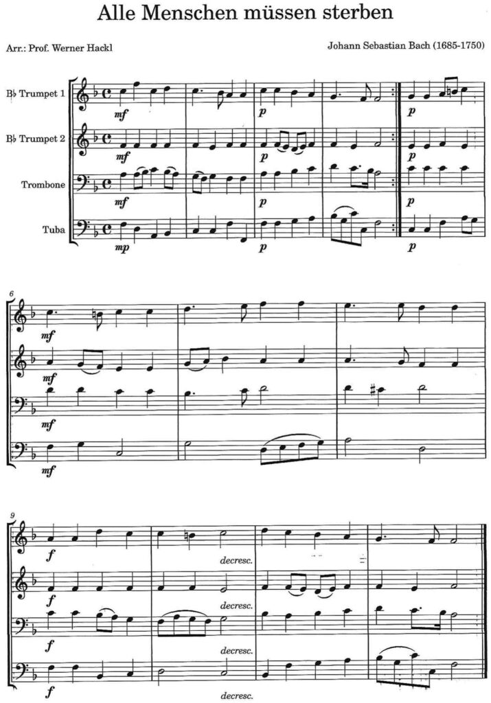 Johann Sebastian Bach, geboren in Eisenach, gestorben zu Leipzig, war ein deutscher Komponist, Kantor, Hofkonzertmeister sowie Orgelvirtuose des Barocks aus Thüringen. In seiner Hauptschaffensperiode war er Thomaskantor zu Leipzig. Seine Werke zählen weltweit zum festen Repertoire der klassischen Musik. Das Orgelbüchlein von Johann Sebastian Bach ist eine Sammlung von Choralvorspielen, die er vor während seiner Amtszeit in den Jahren 1712 bis 1717 in Weimar komponierte (BWV 599-644). Die Einzelsätze der Sammlung verbindet ein hoher künstlerischer Anspruch und der Gedanke der Verwendbarkeit im Gottesdienst. Offenbar ist Bachs doch sehr ehrgeiziges Projekt nach und nach in den Hintergrund getreten; damit umfasst das Orgelbüchlein heute „46 ausgeführte Choralvorspiele“. Jeder Satz erzielt proportionales Gleichgewicht, indem sich Manual- und Pedalstimmen elegant zu einer mustergültigen Orgelpartitur verbinden. Der Titel des Chorals „Alle Menschen müssen sterben„ (BWV 643) steht im 4/4 Takt und in der originalen Tonart G-Dur. Der 4-stimmige Choral wurde nach F transponiert und stellt für Blechbläser eine Bereicherung für den sakralen Raum dar.