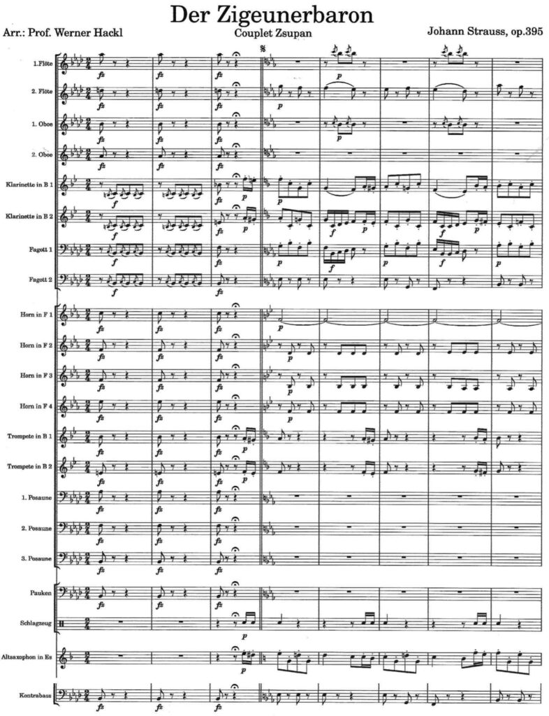 The Gypsy Baron is an operetta in three acts by Johann Strauss. The premiere took place in 1885 at the Theater an der Wien. In the first act of No. 3, Zsupán, a rich pig farmer from Banat, says that “writing and reading were never his speciality”. At the first performance, Alexander Girardi (bass buffo) as Zsupán guaranteed the success of the operetta. Prof. Werner Hackl presents an arrangement of this witty couplet for alto saxophone with accompaniment by a wind orchestra.
