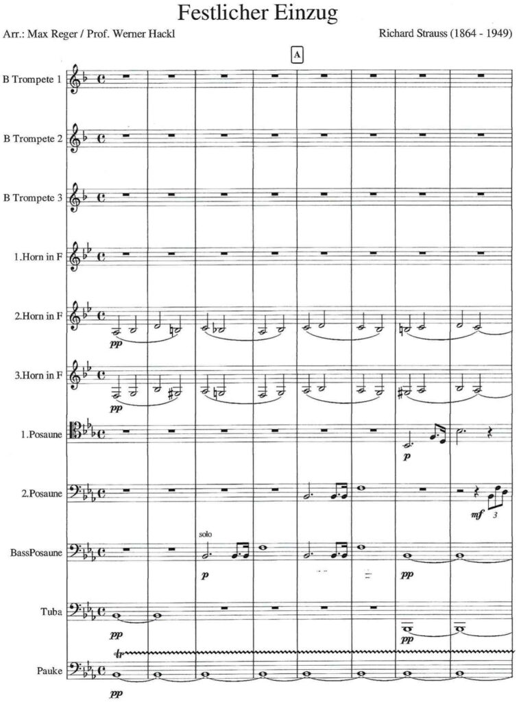 Der “Festliche Einzug” – der ursprüngliche Titel hieß “Feierlicher Einzug der Ritter des Johanniter-Ordens” oder auch Investiturmarsch, AV 103 – für Blechbläser und Pauken wurde 1909 von Richard Strauss komponiert. Anlass war eine Investiturzeremonie der Johanniter, einer Bruderschaft, die noch heute auf der ganzen Welt in der Krankenpflege tätig ist. Die Originalbesetzung dieses Werkes enthielt Stimmen für 15 Trompeten, 4 Hörner, 4 Posaunen, 2 Tuben und Pauken. Strauss hat das Werk später für ein volles Orchester, einschließlich Orgel und optionalem Chor, instrumentiert. Eine Bearbeitung von Max Reger (1873-1916) sieht Orgel, 2 Posaunen und Pauken vor. Werner Hackl hat den „Festlichen Einzug“ für 10-st. Brass-Ensemble (3 Trompeten, 3 Hörner, 3 Posaunen, Tuba) mit Pauken verfasst.