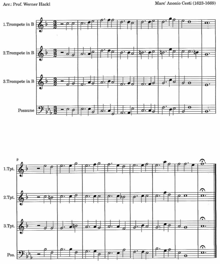 Cestis Festoper Il Pomo d‘ Oro (Der goldene Apfel) gehört zu den prunkvollsten Barockopern. Das düstere Intermezzo an der Höllenpforte aus dem 2. Akt der Oper ist für Blechbläser (2 Cornetti und 3 Posaunen) gesetzt.
