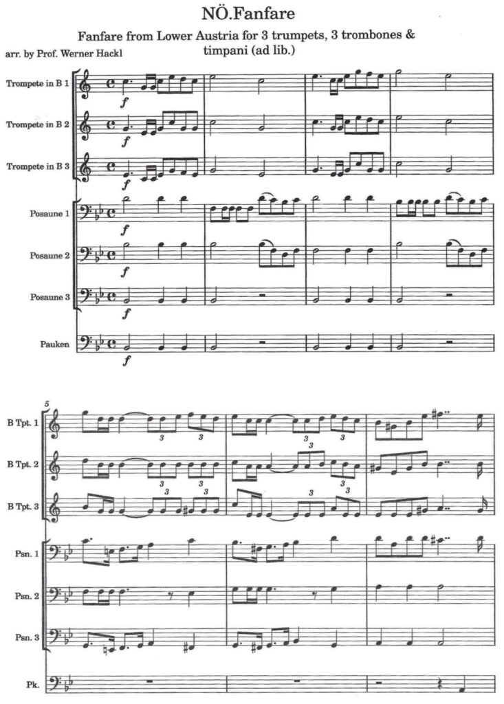 Werner Hackl, arr: NÖ. Fanfare / Fanfare from Lower Austria for 3 trumpets, 3 trombones & timpani (ad lib.)