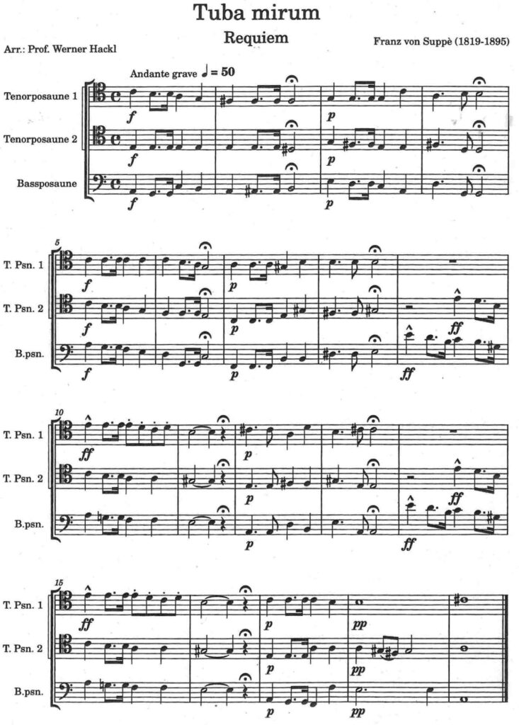 Franz von Suppè, geboren in Split, gestorben in Wien, gilt als Schöpfer der Wiener Operette, obwohl er auch Kirchenmusik verfasste. Mit 21 Jahren wurde Suppè Kapellmeister am Theater in der Josefstadt. Er fand in Franz Pokorny, dem Direktor des Theaters an der Wien, einen Freund und Förderer, der ihn 1845 als Kapellmeister an sein Haus verpflichtete. 1850 verstarb Pokorny, und zu dessen Gedächtnis schuf Suppé fünf Jahre später das Requiem in d-Moll (Missa pro defunctis) für vier Solostimmen, Chor und Orchester. Die Uraufführung erfolgte 1855 in einem Gedenkgottesdienst in der Wiener Piaristenkirche. Die Nummer 3, Tuba mirum, bildet den Glanzpunkt dieses Werkes. Es beginnt mit einem Posaunen-Trio, das die Toten aus den Gräbern zu erwecken scheint; man hört gleichsam, wie aus dieser Gegend die erste und aus jener die zweite, aus einer andern endlich die dritte Posaune rufend ertönt. Der Posaunensatz erinnert an das Aequale-Blasen bei Leichenbegängnissen sowie öffentlich am Allerseelentag. Von Beethoven und Bruckner sind einschlägige Kompositionen überliefert, wie auch an der besagten Stelle in Suppès Requiem.
