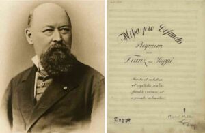 Franz von Suppè, born in Split and died in Vienna, is considered the creator of the Viennese operetta, although he also composed church music. At the age of 21, Suppè became Kapellmeister at the Theater in der Josefstadt. He found a friend and supporter in Franz Pokorny, the director of the Theater an der Wien, who appointed him Kapellmeister to his house in 1845. Pokorny died in 1850, and in his memory, Suppé composed the Requiem in D minor (Missa pro defunctis) for four solo voices, choir, and orchestra five years later. The premiere took place 1855, at a memorial service in the Piarist Church in Vienna. Number 3, Tuba mirum, is the highlight of this work. It begins with a trombone trio that seems to awaken the dead from their graves; one hears, as it were, the first trumpet calling from this area, the second from that, and finally the third from another. The trombone passage is reminiscent of the blowing of the aequale at funerals and publicly on All Souls’ Day. Relevant compositions by Beethoven and Bruckner have survived, also be found at the aforementioned point in Suppè’s Requiem.
